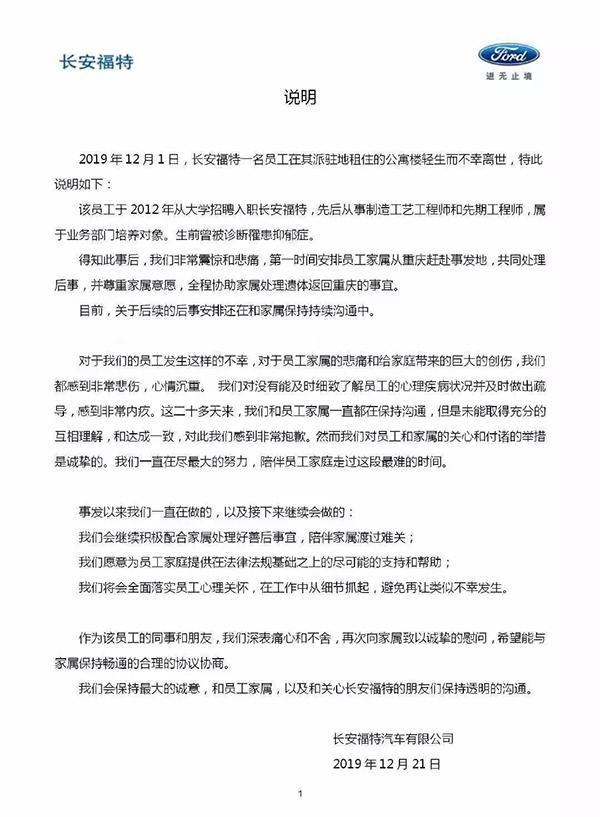 12月21日,长安福特公司通过官方微博对此事进行回应,《说明》中称去世员工先后从事制造工艺工程师和先期工程师,属于业务部培养对象,生前曾被诊断罹患抑郁症。事发后,公司非常震惊和悲痛,第一时间安排员工家属从重庆赶赴事发地共同处理后事。目前,关于后续的后事安排还在和家属保持持续沟道中,但是未能取得充分的互相理解和达成一致。