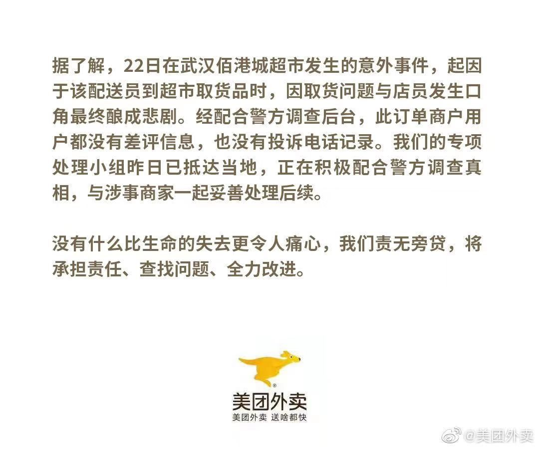 12月23日,美团对此作出正式回应。美团表示,该事件起因于配送员到超市取货品时,因取货问题与店员发生口角最终酿成悲剧。经配合警方调查后台,此订单商户用户都没有差评信息,也没有投诉电话记录。公司专项处理小组昨日已抵达当地,正在积极配合警方调查真相,与涉事商家一起妥善处理后续。