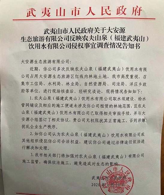 有媒体就此事向农夫山泉质询,该公司回应称,这是一场与当地旅游公司的纠纷,农夫山泉在当地是获得审批之后作业,这是合法合规行为。此外,农夫山泉向媒体公布一份武夷山市人民政府1月10日的调查情况告知书显示,政府方面在召集水利局、林业局、自然资源局等进行现场核查后,情况是:农夫山泉(福建武夷山)饮用水有限公司取水坝建设、给水官网铺设及相应的施工便道未涉及你公司(大安源旅游生态有限公司)租赁的林地范围,且农夫山泉已经取得相关审批手续,并于大安源小组签订了相关协议。