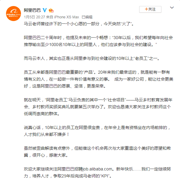 而阿里巴巴官微先前也回应称,马云自身也是从阿里参与到社会建设的10年以上“老员工”之一。回应强调称,员工从来都是阿里巴巴最重要的“产品”,老员工在阿里很宝贵,“人才我们从来都不嫌多”。