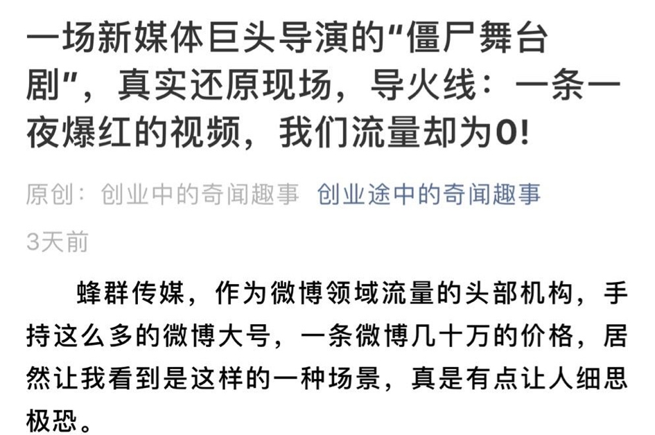 10月14日,一篇微信爆文,质疑蜂群文化流量造假。该文称蜂群旗下博主,在接了推广发广告后,广告视频播放量在两小时内达到几十万,还有评论表示已领券或已购买,但网店访客量跟往常相差无几。17日,蜂群文化回应称涉事文章是恶意捏造不实言论,已举报文章并报案。10月19日,微博管理员声明造假事件博主因存在刷评论行为已被关停账号,其所属MCN机构蜂群文化所有账号被暂停在微博的广告投放和微任务接单。