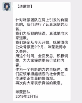 由《一个出身寒门的状元之死》讨论热度带来了系列连锁反应。2月1日,咪蒙在其微博发布道歉信称,“针对咪蒙团队在网上引发的负面影响,我们进行了认真深刻的反省。我们为所犯的错误,真诚地向大家道歉我们。决定从今天开始,咪蒙微信公众号停更2个月、咪蒙微博永久关停……”
