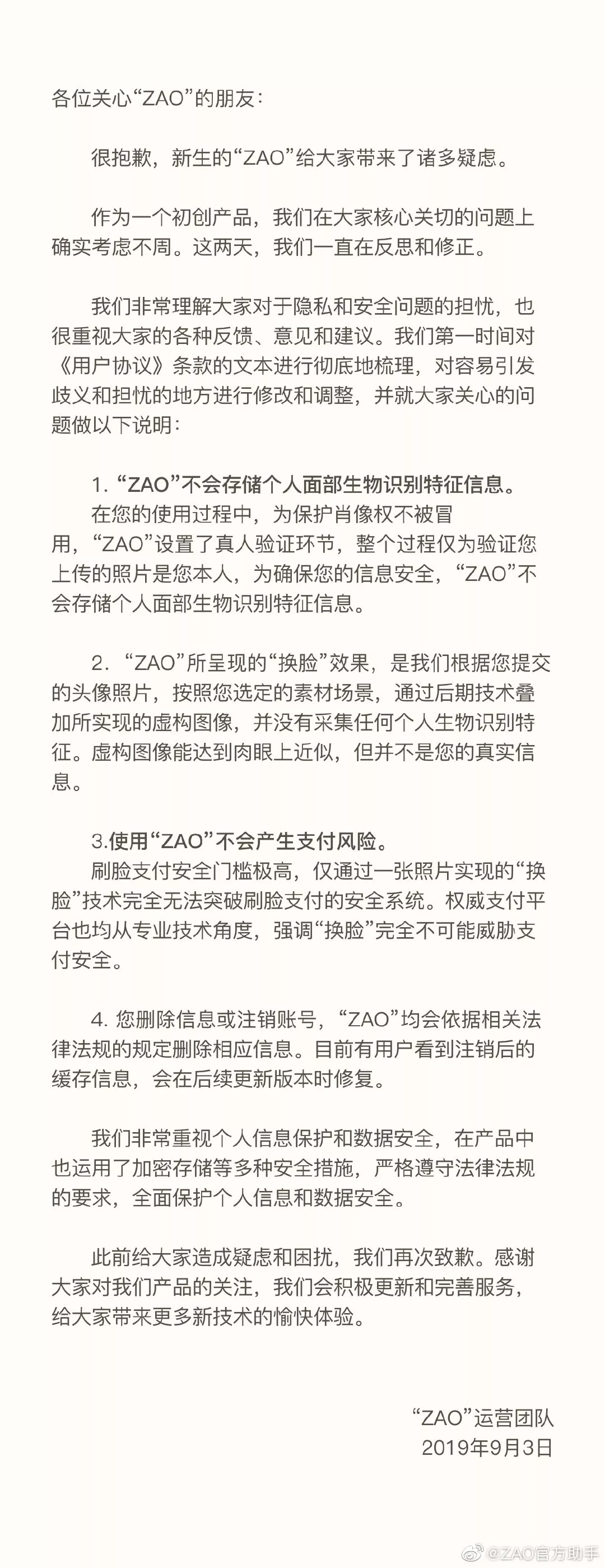 9月3日,工业和信息化部网络安全管理局对相关负责人进行了问询约谈,同日,“ZAO”运营团队发布声明称,“ZAO”不会存储个人面部生物识别特征信息。