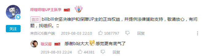 B站官方也很快表示会坚决维护和保障UP主的正当权益,并为创作者提供相应的法律帮助。