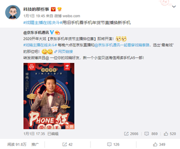 在交互性最强的微博,京东手机官微十天连发十张直播预热海报并抽奖互动,送出手机、耳机、蓝牙音箱等多样奖品。同时科技、搞笑、美学等不同领域的近30个KOL配合转发互动,进一步提高了网友关注,直接触达人数多达1300余万,为站内直播的开展有效引流。