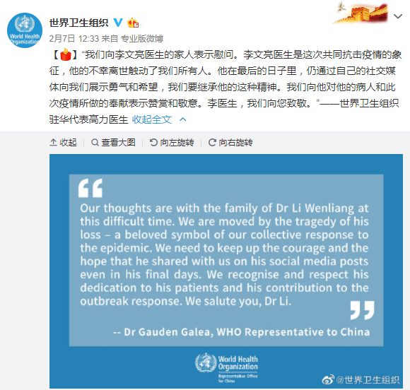 李文亮的去世引起社会各界对其的深痛哀悼和致敬。2月7日中午,世界卫生组织官方微博@世界卫生组织 发布贴文纪念李文亮医生。