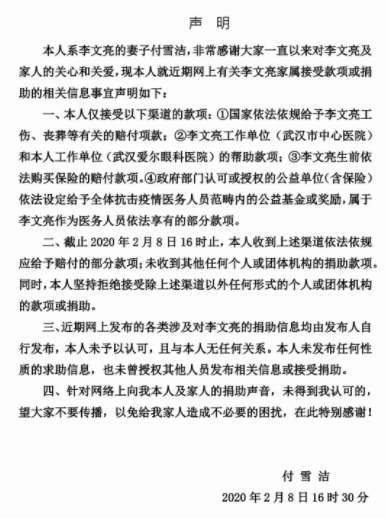 同日,李文亮医生妻子微博发布信息澄清:本人未发布任何性质的求助信息。
