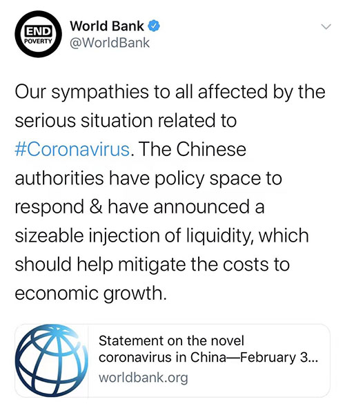 同日,世界银行表示,对感染新型冠状病毒的所有人感到同情。世界银行认为,中国政府方面有充足的政策空间来应对这一疫情,并且为市场注入了相当大规模的流动性,这些举措能够缓和疫情给中国经济增长带来的损失。