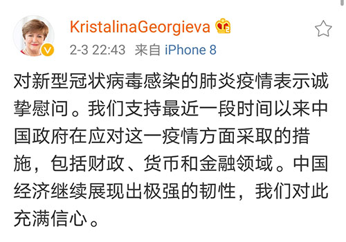 当地时间2月3日,国际货币基金组织IMF总裁克里斯塔利娜·格奥尔基耶娃表示,对新型冠状病毒感染的肺炎疫情表示诚挚慰问,我们支持最近一段时间以来中国政府在应对这一疫情方面采取的措施,包括财政、货币和金融领域。中国经济继续展现出极强的韧性,我们对此充满信心。