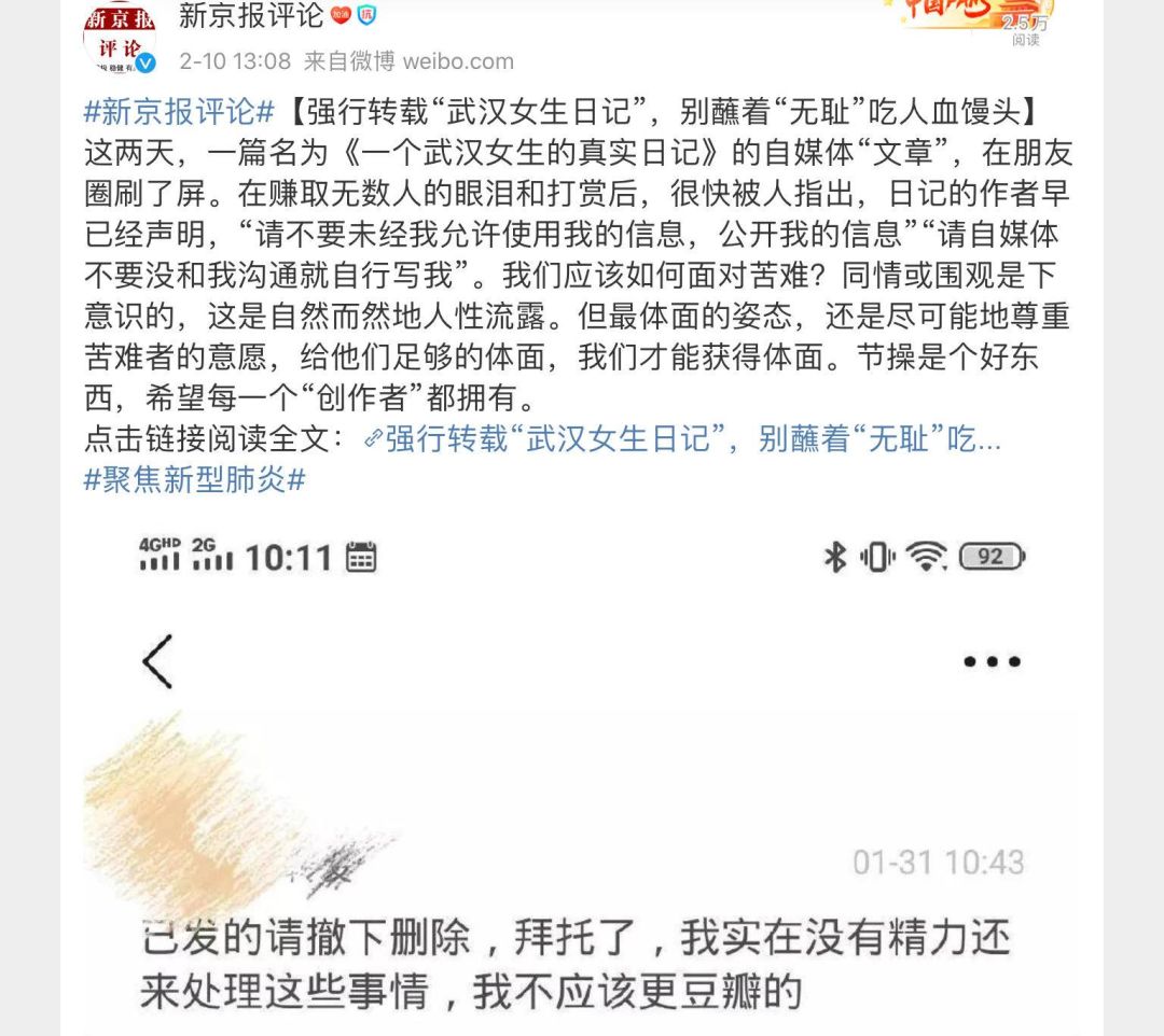 但很快有人指出,日记作者,早在1月31日就已声明,“请不要未经我允许使用我的信息,公开我的信息”“请自媒体不要没和我沟通就自行写我”。