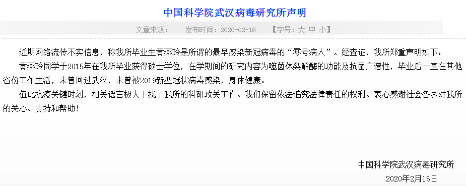 同日,中国科学院武汉病毒研究所发布声明称:“近期网络流传不实信息,称我所毕业生黄燕玲是所谓的最早感染新冠病毒的‘零号病人’。经查证,黄燕玲同学于2015年在我所毕业获得硕士学位,在学期间的研究内容为噬菌体裂解酶的功能及抗菌广谱性,毕业后一直在其他省份工作生活,未曾回过武汉,未曾被2019新型冠状病毒感染,身体健康。”