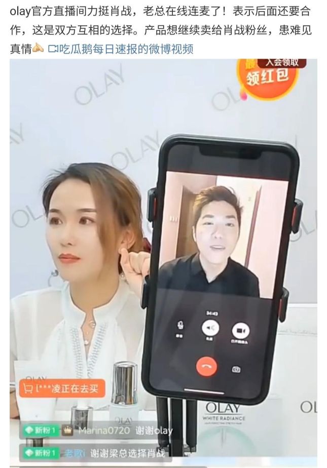 不过Olay依然力挺肖战,还在官方直播间连麦老总,表示支持。