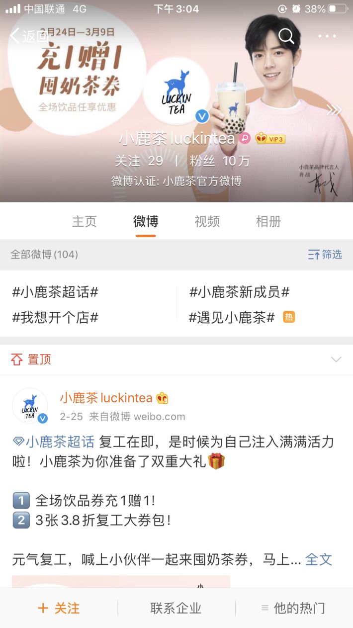 另一品牌小鹿茶,目前也没有反应,不过首页图与置顶都还是肖战。