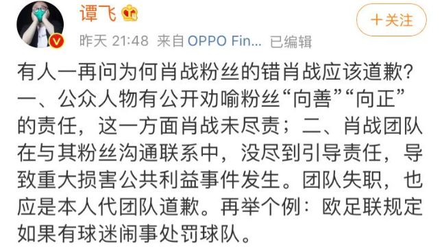 3月1日-3月2日期间,影评人谭飞数次发文评论此事,并称明星应该“适时劝喻引导粉丝”。
