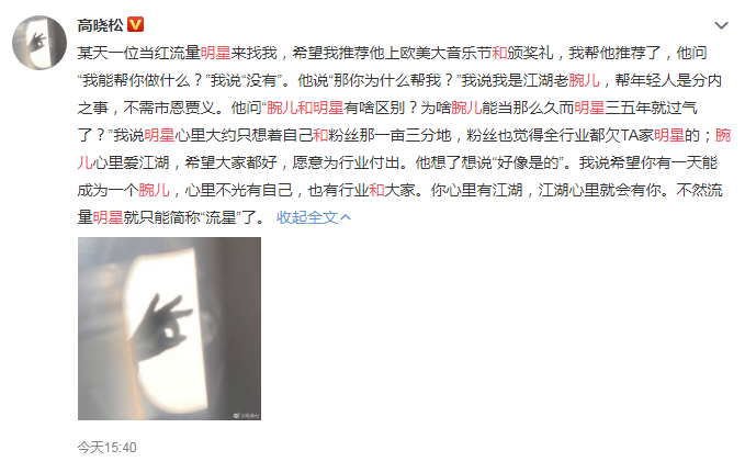 3月2日15:40,@高晓松发文谈“腕儿和明星”的区别。