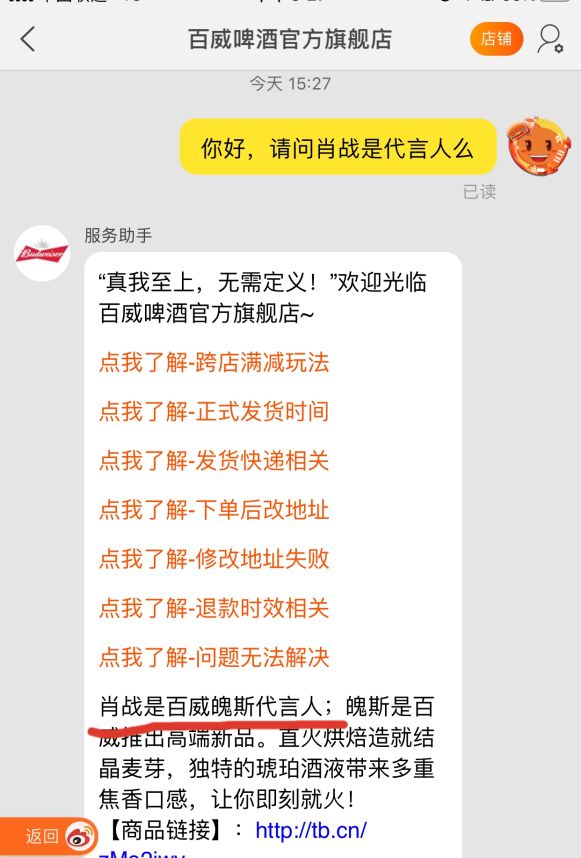 除此之外,百威虽然没有高调地发布相关信息,但已经在淘宝店铺中的自动回复中,明确表示肖战是代言人。