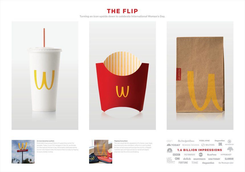 2018年,美国加州林伍德市的一家麦当劳为庆祝国际妇女节的到来,在当地时间 3 月 7 日率先将麦当劳标志性的 Logo “ M ”颠倒过来变成了“ W ”——妇女“ Women ”这个单词的首字母。