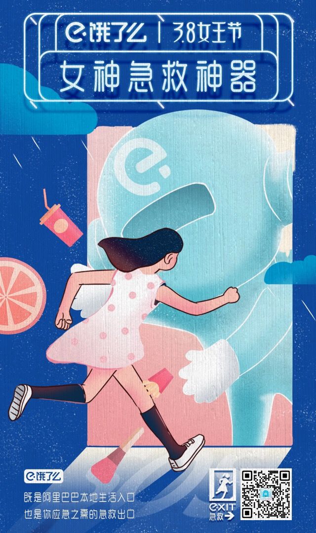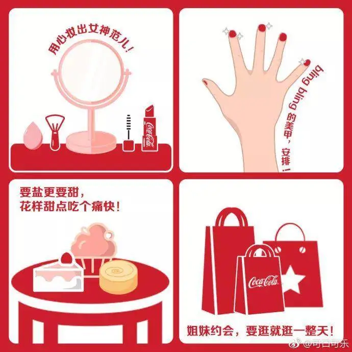 这种借势海报比较简单易行,漫画的呈现方式也蛮可爱,最简单的祝福就是让女生吃喝玩乐享受这一天吧。