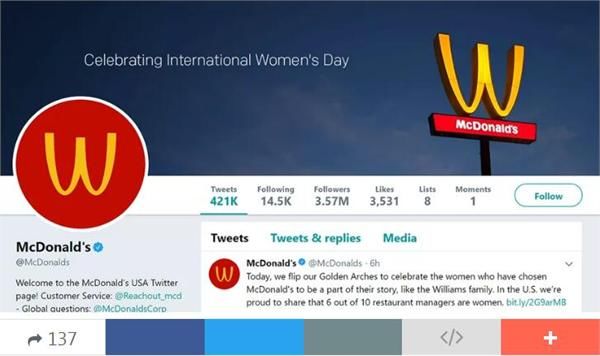 紧接着,麦当劳的官方推特主页,也将0头像也换成了“W”标志,以此庆祝国际妇女节。