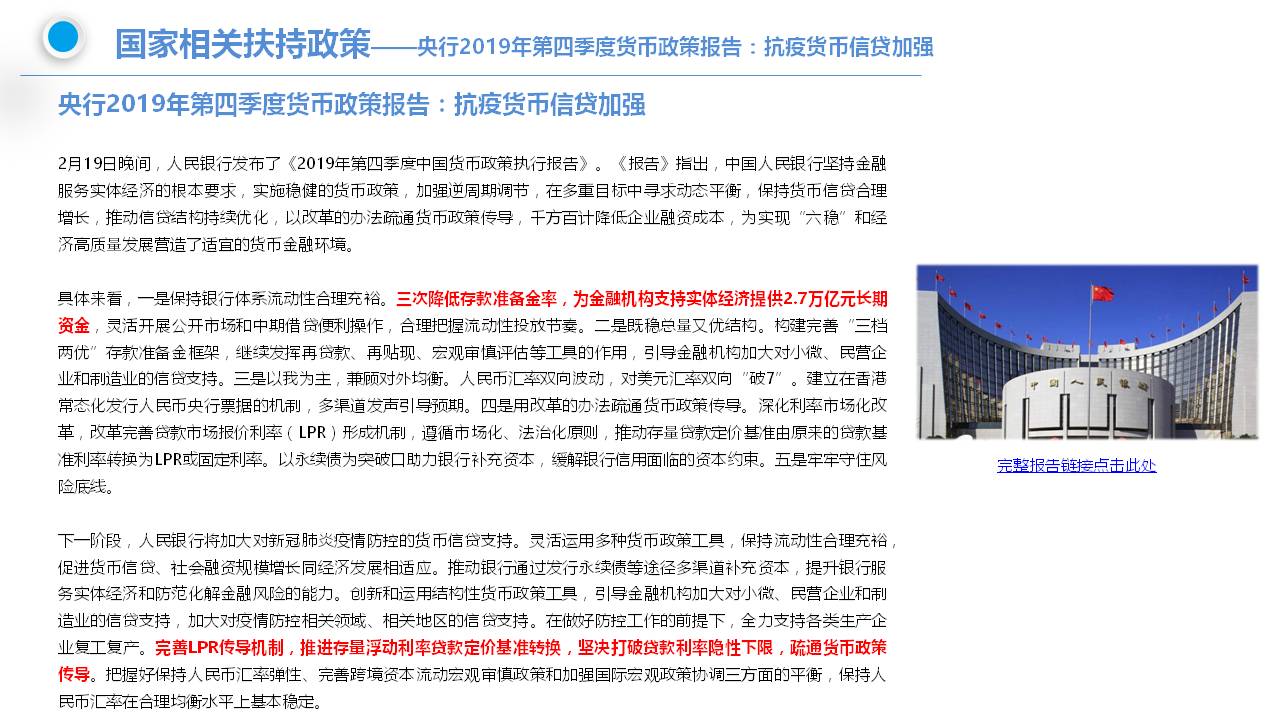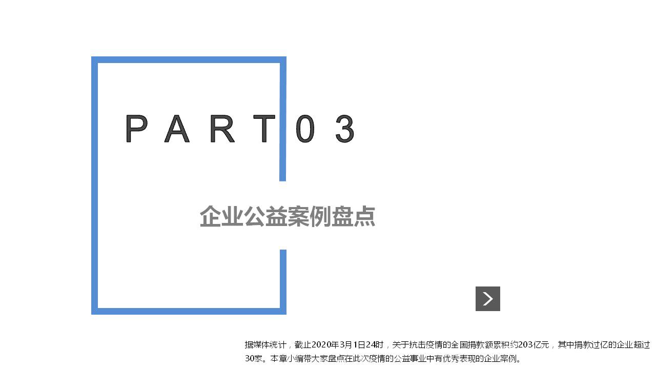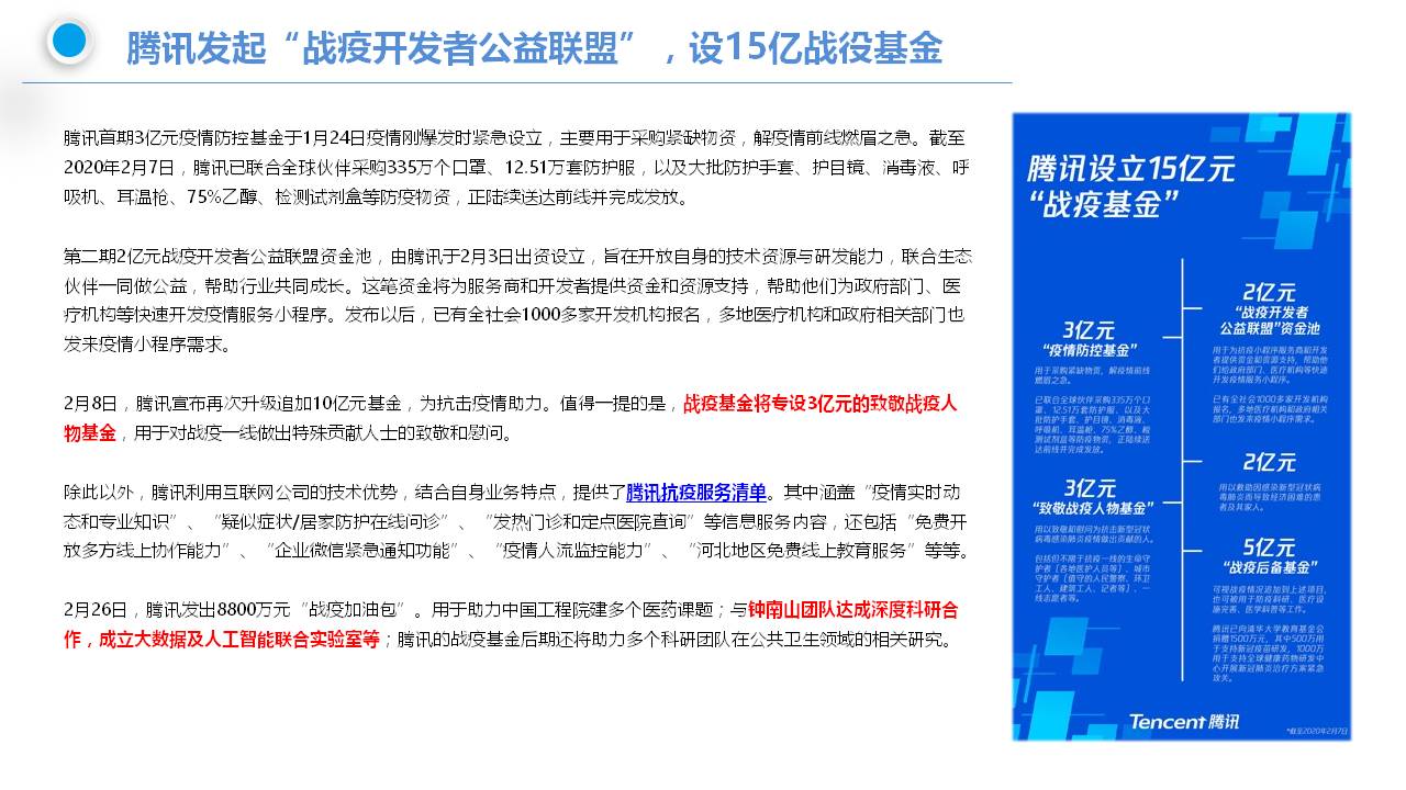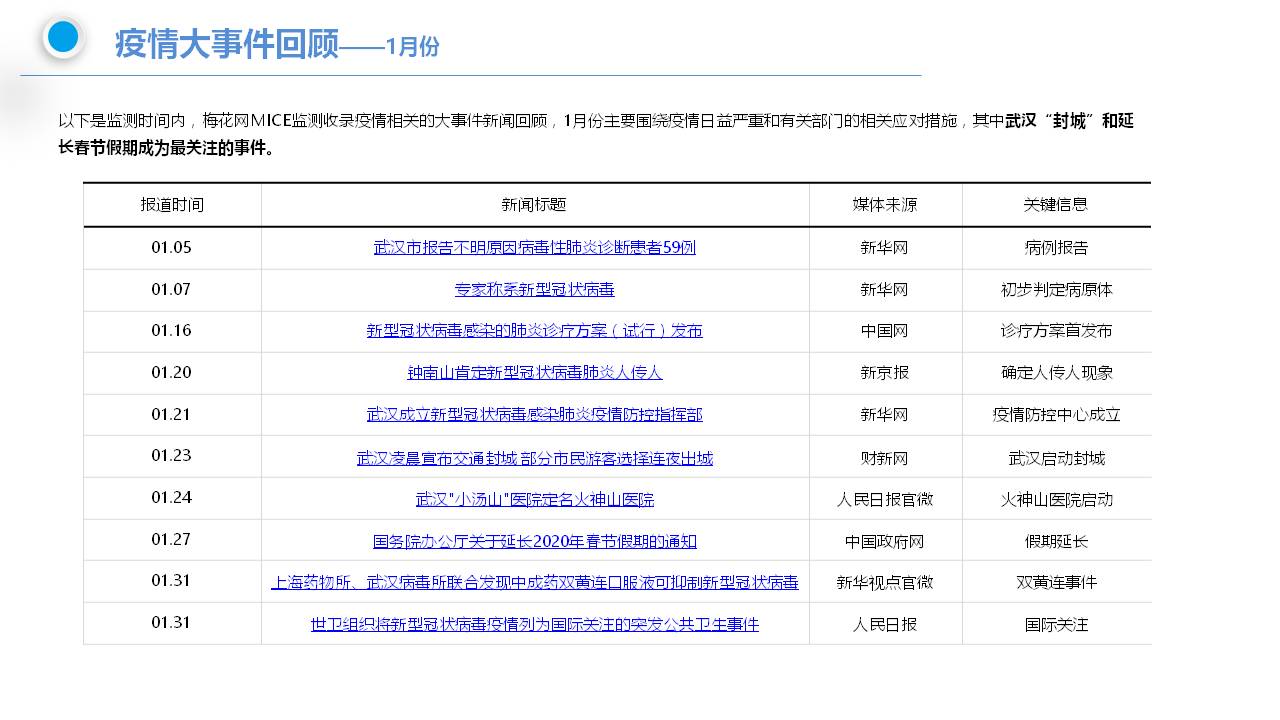 本报告主旨是了解此次新型冠状病毒疫情重大舆情事件及相关应对政策,盘点优秀的企业应对方案,了解疫情有关负面舆情事件。报告分为疫情大事件回顾、国家相关扶持政策、企业公益案例盘点、企业应对案例盘点、疫情有关负面事件盘点。以下截图仅展现部分内容,各位读者可在文末点击超链接自行下载了解。