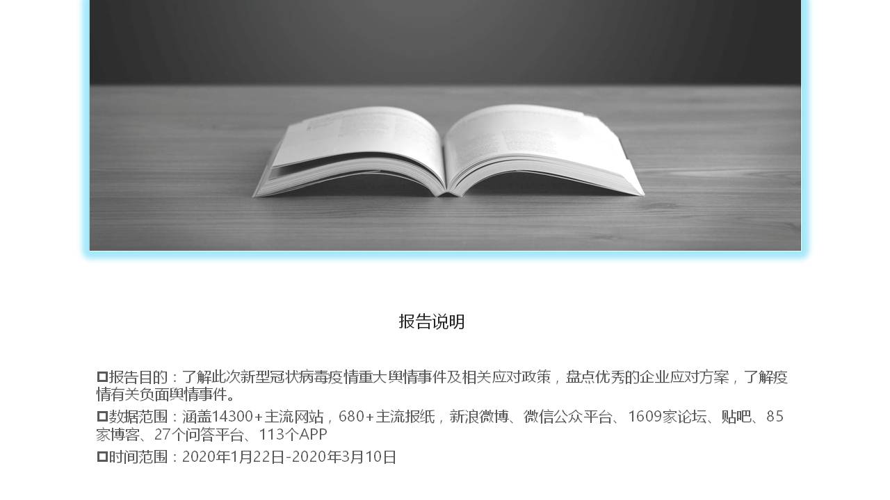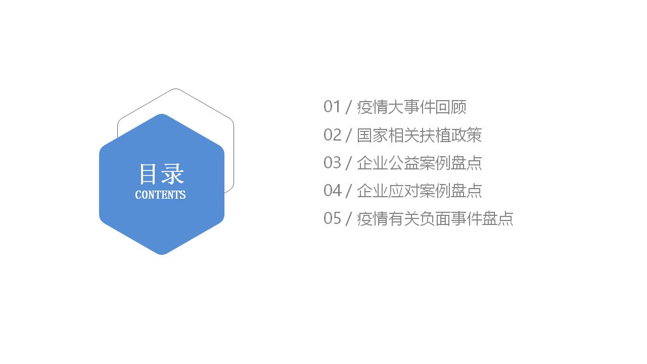 本报告主旨是了解此次新型冠状病毒疫情重大舆情事件及相关应对政策,盘点优秀的企业应对方案,了解疫情有关负面舆情事件。报告分为疫情大事件回顾、国家相关扶持政策、企业公益案例盘点、企业应对案例盘点、疫情有关负面事件盘点。