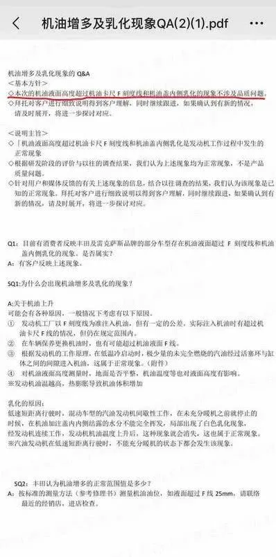 此外,有网友曝出一份疑是丰田汽车的销售话术,而这正好有关于目前丰田系车型出现的机油增多和机油盖乳化的问题。该份文件更加加剧了众多车主对丰田汽车的不满情绪。