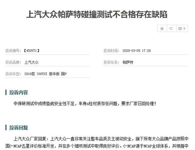 对此,部分帕萨特车主以此结果为依据在相关汽车投诉网站进行了投诉,要求厂家给出说法、进行召回。