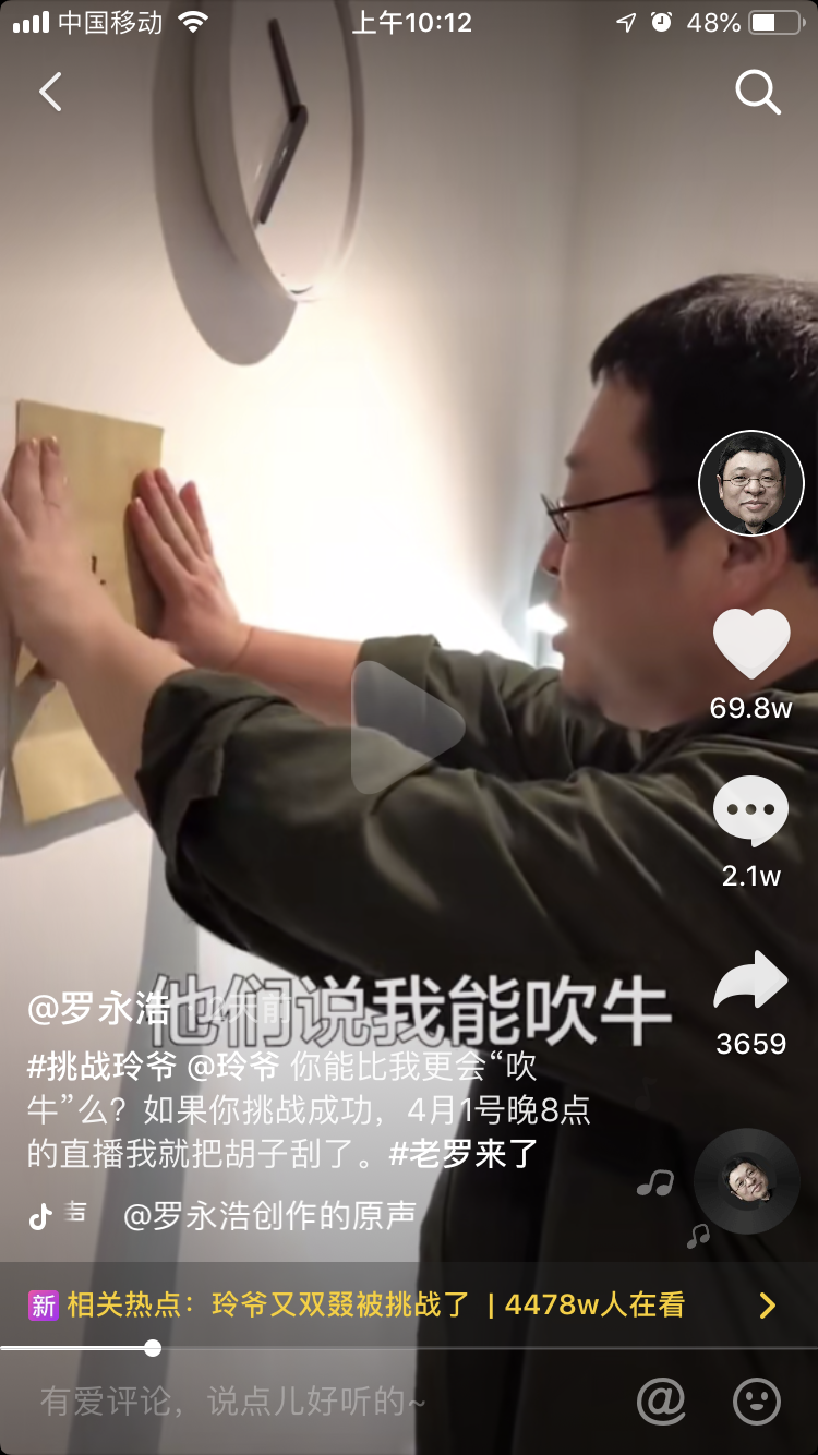 在发布的抖音短视频中,罗永浩也展现自己超强的网感,更实力上演的一番“吹牛”自黑。