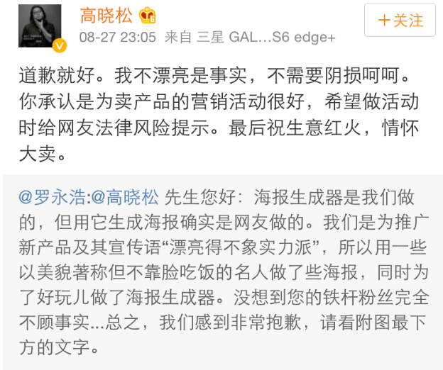 2015年,锤子科技推出坚果手机,一句“漂亮得不像实力派的slogan”刷屏全网。万万没想到却惹到了高晓松,原来有网友用锤子科技推出的海报生成器对高晓松的照片进行了二次创作,此举发高晓松不满,引发侵权质疑。最终事件以罗永浩的致歉收尾。