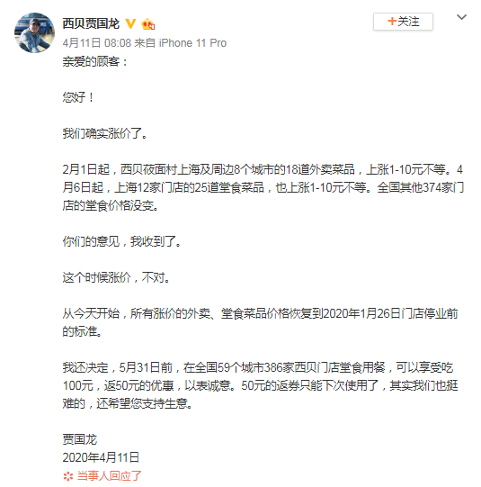 4月11日,西贝餐饮董事长贾国龙在其微博也对涨价事实致歉。称:“这个时候涨价不对。所有涨价的外卖、堂食菜品价格恢复到2020年1月26日门店停业前的标准。”