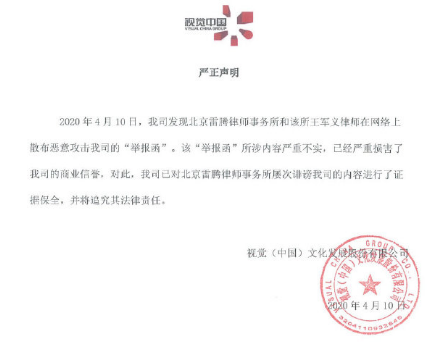 4月10日晚间,视觉中国官方微博对此作出回应称,该“举报函”所涉内容严重不实,已经严重损害了我司的商业信誉,对此,我司已对北京雷腾律师事务所屡次诽谤我司的内容进行了证据保全,并将追究其法律责任。