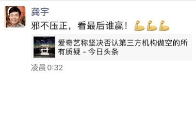 此外,爱奇艺CEO龚宇今日在朋友圈转发爱奇艺否认造假的声明,并配文称,邪不压正,看最后谁赢。