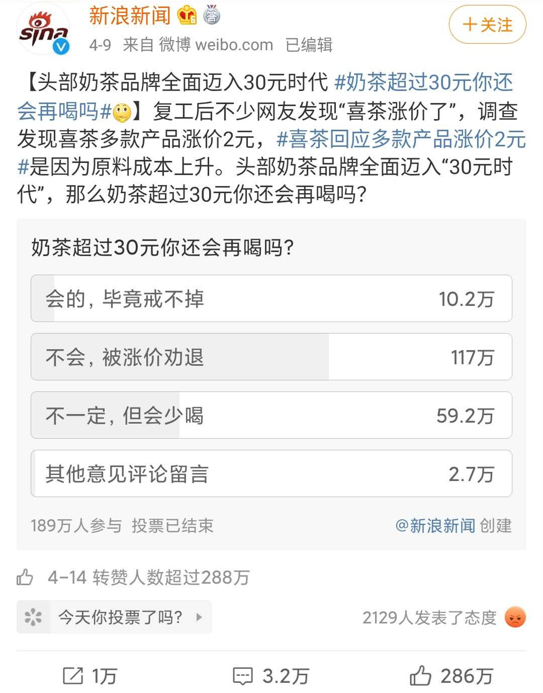 关于奶茶,有61.9%的网友投票表示会被涨价劝退,31.3%的网友投票表示会减少喝奶茶的次数。