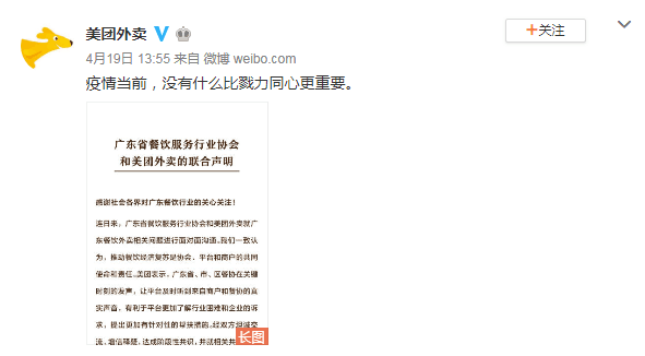 此前,广东省餐饮服务行业协会在公众号上发布《广东餐饮行业致美团外卖联名交涉函》相关文章,指出美团外卖向餐饮企业收取的高额外卖佣金,已超过餐饮企业承受极限。