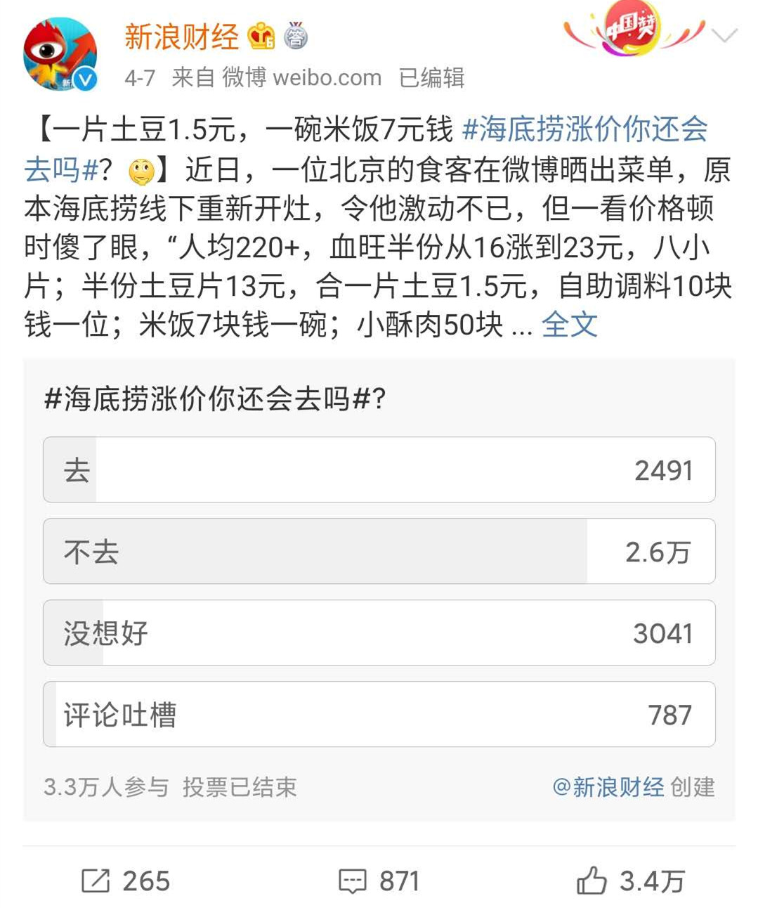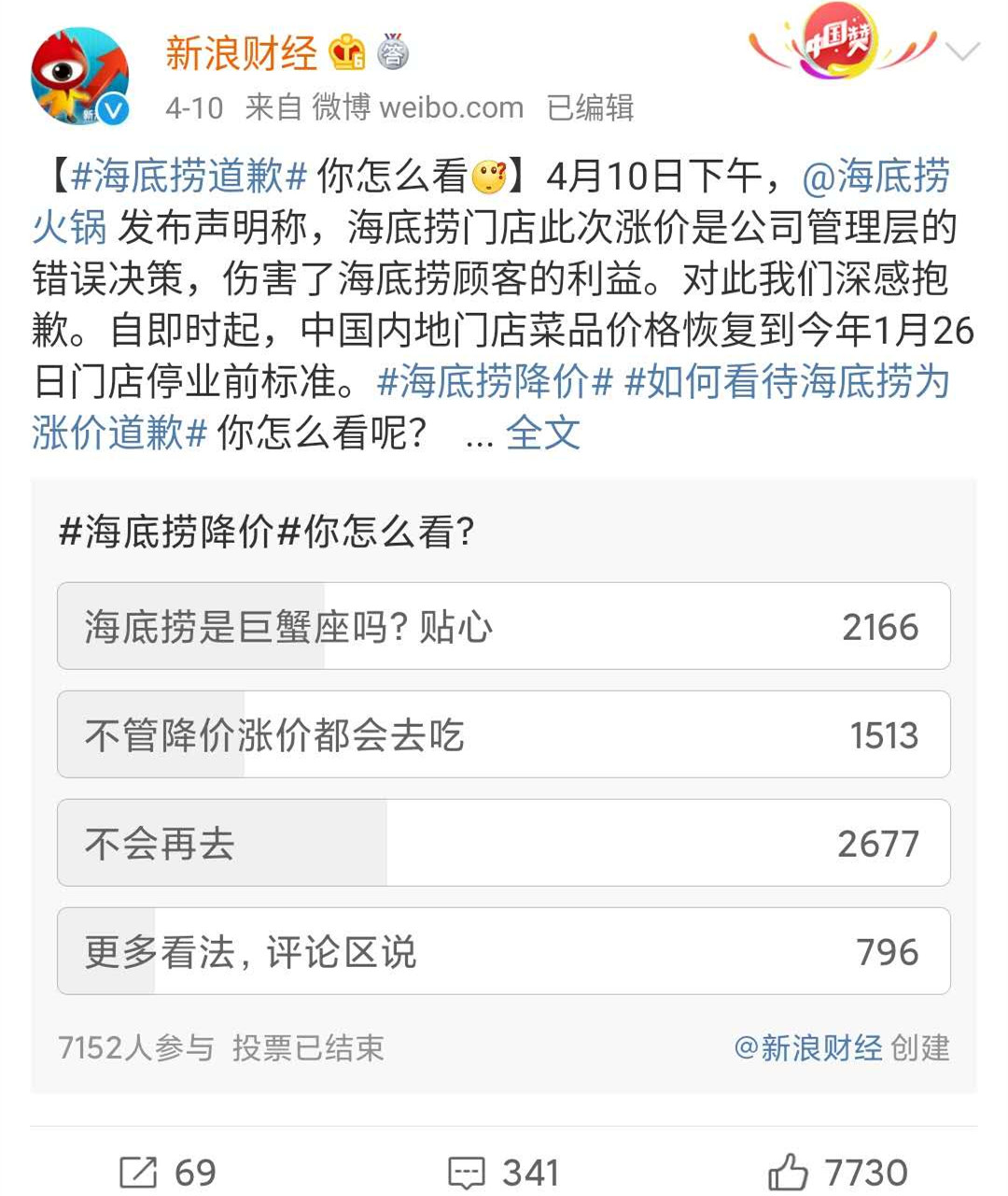 海底捞方面,刚曝光涨价时,约有78.8%的网友投票表示不会再去海底捞消费。在海底捞降价道歉后,仍有37.4%的网友投票表示不会再去消费,认为海底捞此次降价道歉贴心的有30.3%,21.2%的网友表示不论涨价与否都会去消费。
