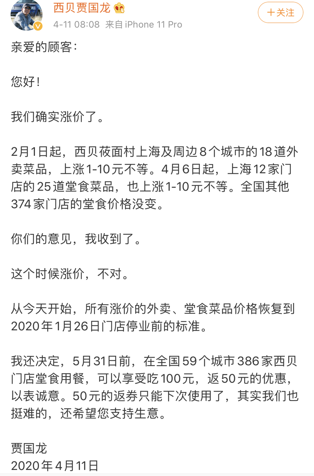 西贝莜面村:4月11日,西贝餐饮董事长贾国龙在其微博也对涨价事实致歉。称:“这个时候涨价不对。所有涨价的外卖、堂食菜品价格恢复到2020年1月26日门店停业前的标准。”贾国龙表示,2月1日起,西贝莜面村上海及周边8个城市的18道外卖菜品价格上涨1-10元不等。4月6日起,上海12家门店的25道堂食菜品,上涨了1-10元不等。全国其他374家门店的堂食价格没变。5月31日前,在全国59个城市386家西贝门店堂食用餐,可以享受吃100元返50元的优惠,以表诚意。