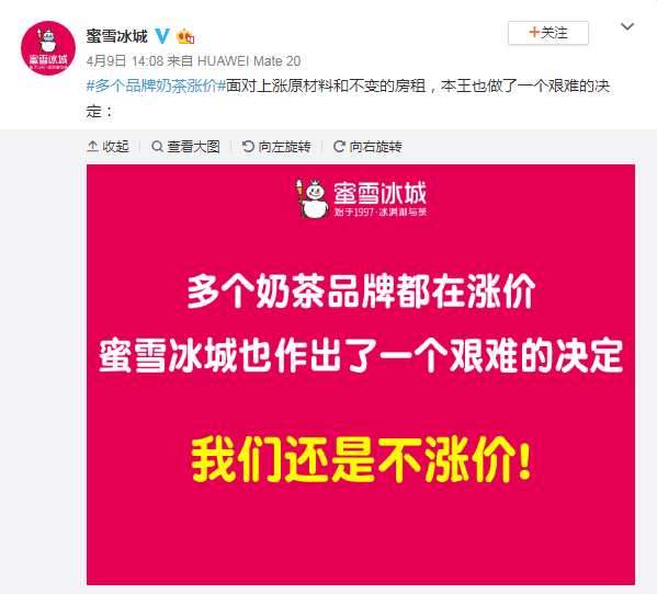 蜜雪冰城:一向以性价比为主打特色的蜜雪冰城,借机自我营销了一把。在其官方微博表示,面对上涨原材料和不变的房租,蜜雪冰城也做了一个艰难的决定:还是不涨价。