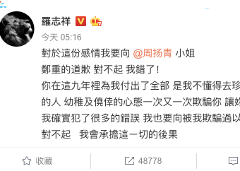 罗志祥的第一份回应,是在12点12分。在3个小时能回应,时间上还算及格,但核心不在时间,而在内容上。