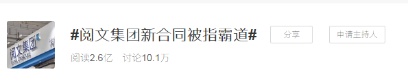 该事件在微博和各大论坛讨论发酵几天后,舆情热度居高不下,截至现在#阅文集团新合同被指霸道#热搜获得2.6亿的阅读和10.1万的讨论。