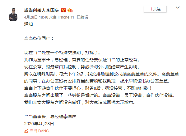 当当股东之间出现了一些纠纷是暂时的。当当没错,员工没错,合作伙伴没错。我们夫妻大股东之间没有做好,对大家造成困扰表示歉意。