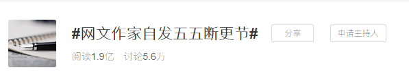 此外,部分网文作者则发起“55断更节”以抵制霸权合同,维护自身的权益。这一活动也引起越来越多网文作者甚至其他领域人士的响应。截至目前该话题也获得1.9亿阅读,5.6万的讨论。