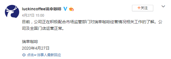 当天下午,瑞幸官方微博表示:目前,公司正在积极配合市场监管部门对瑞幸咖啡经营情况相关工作的了解。公司及全国门店运营正常。