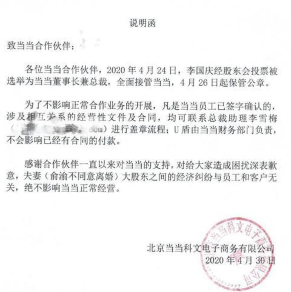 4月30日,网上流传的一份“说明函”显示,李国庆“代表”当当向合作伙伴深表歉意,并称夫妻纠纷不影响正常经营。
