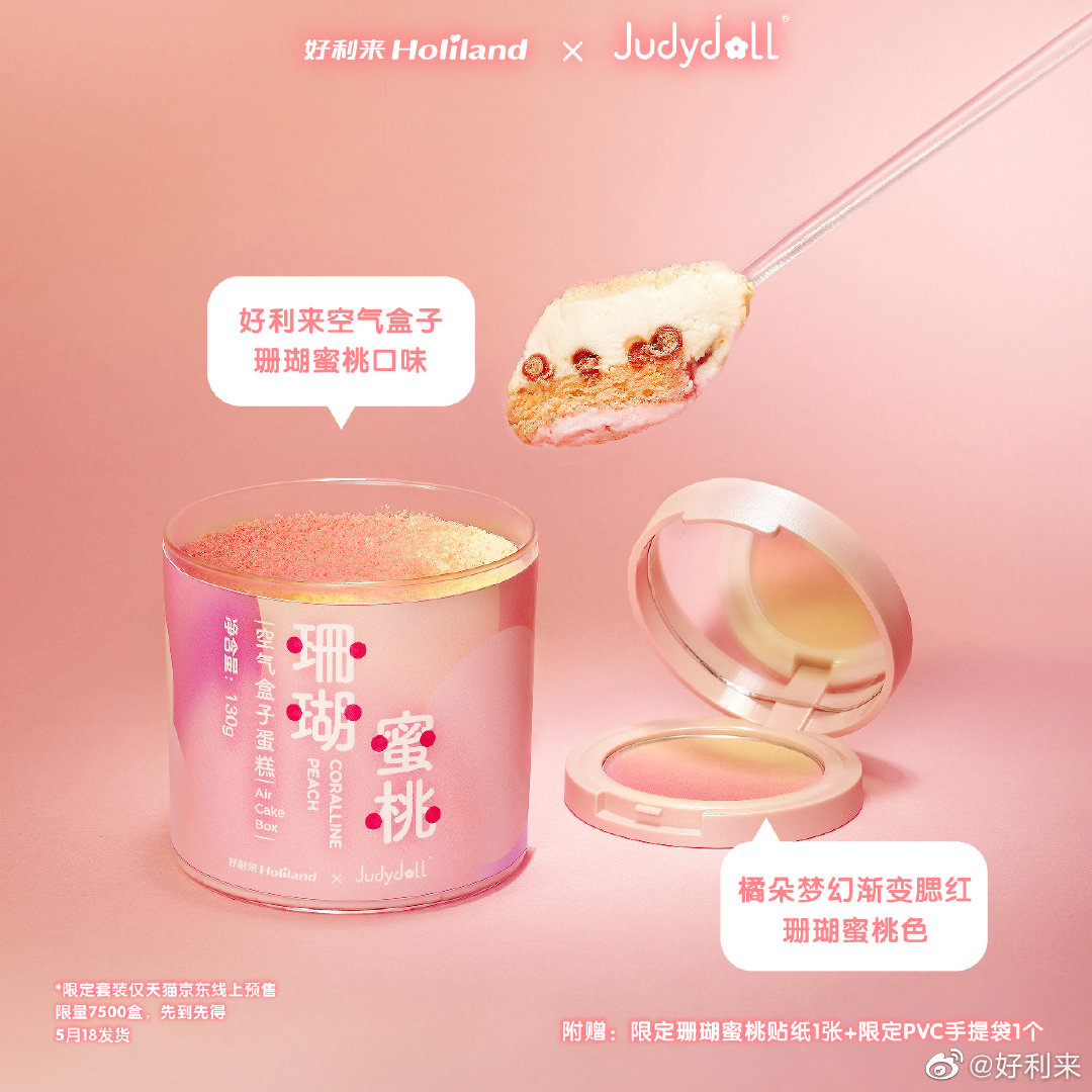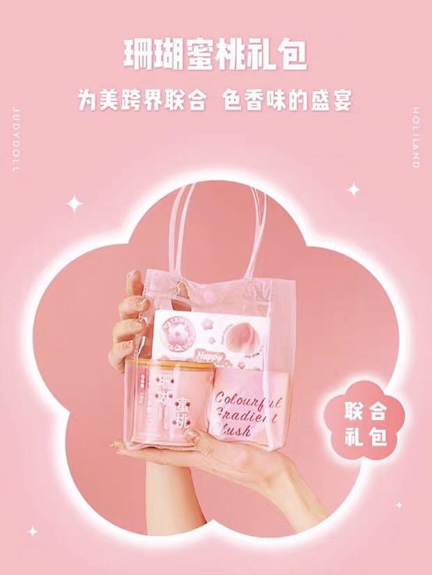 好利来联合国产彩妆品牌Judydoll橘朵推出了珊瑚蜜桃礼包,包装粉粉嫩嫩很少女,礼包内有还附赠珊瑚蜜桃贴纸1张和限定PVC手袋1个。