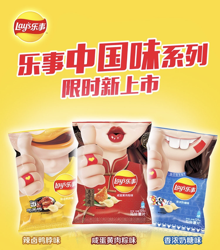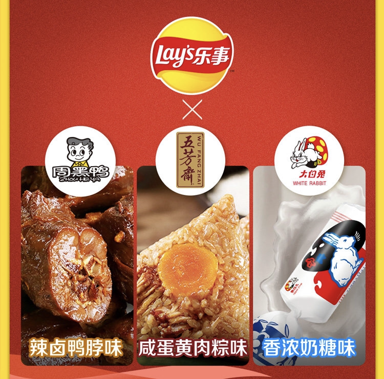 乐事和大白兔、五芳斋、周黑鸭联名推出了中国味系列薯片:香浓奶糖味、辣卤鸭脖味、咸蛋黄肉粽味。