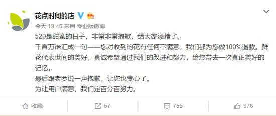 花点时间方面表示:“520是甜蜜的日子,非常非常抱歉,给大家添堵了。千言万语汇成一句——您对收到的花有任何不满意,我们都为您做100%退款。鲜花代表世间的美好,真诚希望通过我们的改进和努力,给您带去一次真正美好的记忆。”