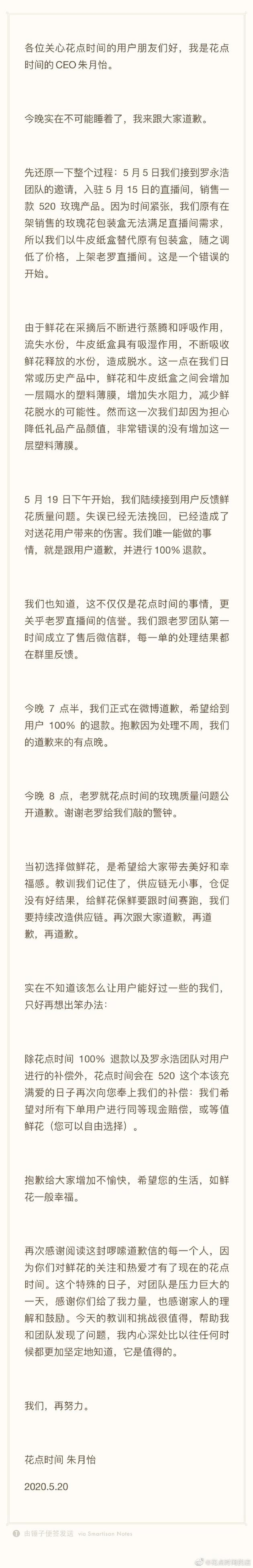 花点时间CEO朱月怡在@花点时间的店官方微博致歉并回应称,失误已经无法挽回,已经造成了对送花用户带来的伤害。我们唯一能做的事情,就是跟用户道歉,并进行100%退款。并表示,除花点时间100%退款以及罗永浩团队对用户进行的补偿外,花点时间会在520这个本该充满爱的日子再次向您奉上我们的补偿:我们希望对所有下单用户进行同等现金赔偿,或等值鲜花(您可以自由选择)。