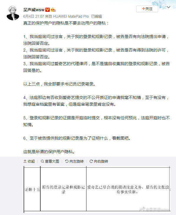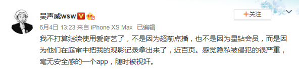 此外,6月4日下午“爱奇艺庆余年超前点播案”原告吴声威通过个人微博发文称,“不打算继续使用爱奇艺了,不是因为超前点播或星钻会员,而是因为爱奇艺在庭审中把我的观影记录拿出来了,上百页。”感觉隐私被侵犯。而当天晚上原告再发微博,直指爱奇艺并没有向法院提出申请。