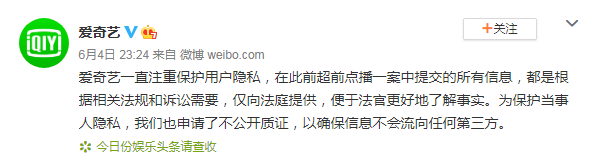 对此,爱奇艺当天晚上11点24分回应称:“爱奇艺一直注重保护用户隐私,在此前超前点播一案中提交的所有信息,都是根据相关法规和诉讼需要,仅向法庭提供,便于法官更好地了解事实。为保护当事人隐私,我们也申请了不公开质证,以确保信息不会流向任何第三方。 ”