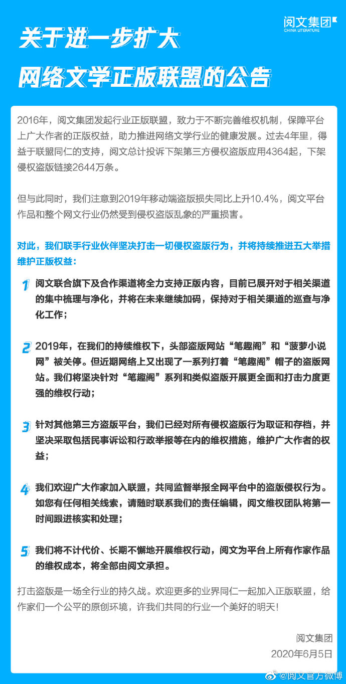 6月5日,发布 “正版联盟”公告,公布一系列打击盗版成果,并推五大实质举措打盗版。公告强调对网络文学侵权盗版 “零容忍 “,联合各合作渠道支持正版内容并展开集中巡查与净化,同时阅文已对全网相关侵权盗版行为取证,将针对 “笔趣阁”系列盗版网站和其他侵权盗版行为发起进一步维权行动。阅文承诺,将不计代价、长期不懈地开展维权行动,全部承担为其平台上作家作品维权的成本,并邀请作家和行业加入正版联盟。